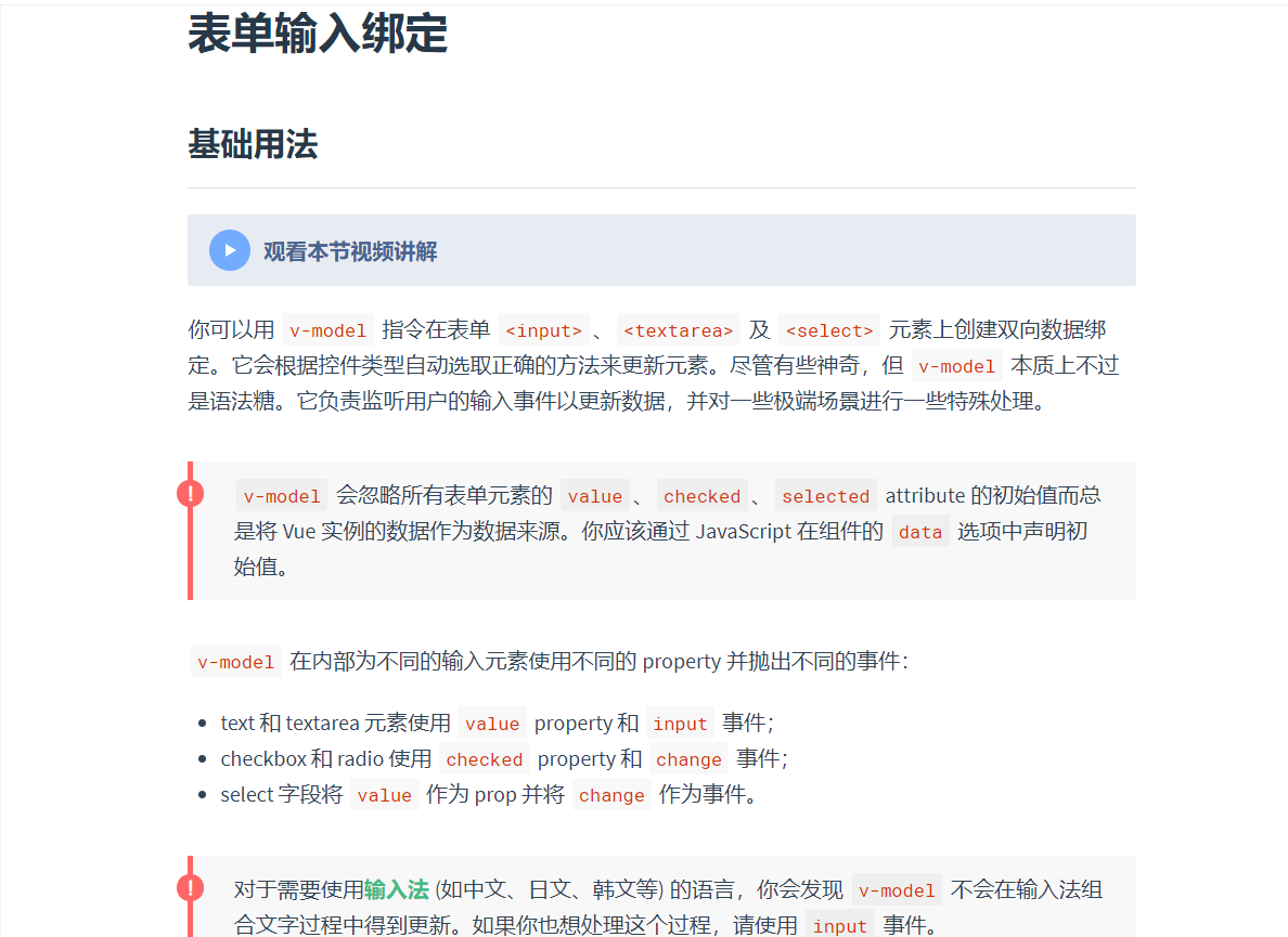 例如监听 input 事件,一般使用:v-on:input。有时也会使用v-on:change, onChange 事件是在移出焦点时才会触发。因此这样就不会实时地更新数据了,具体选择监听哪个事件看实际需求而定。